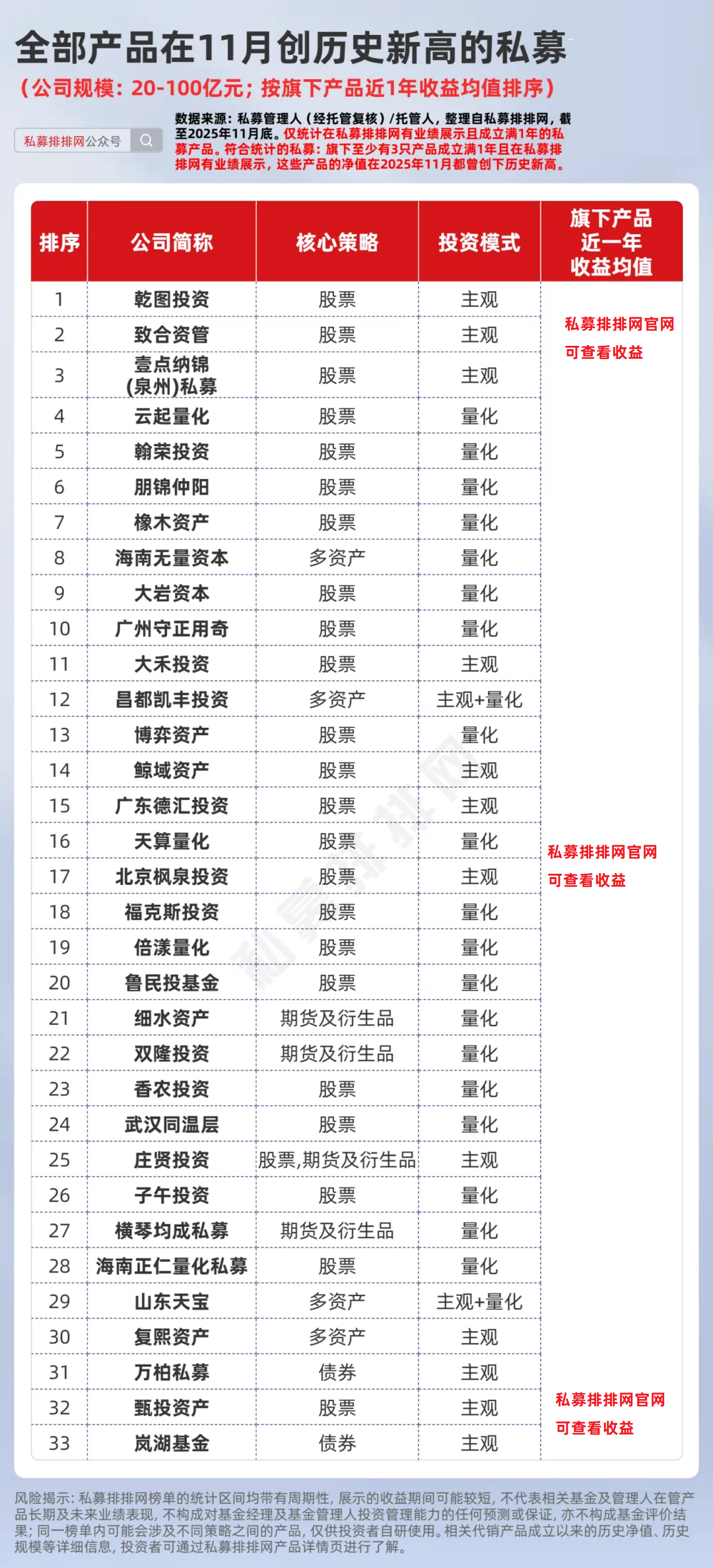 为了给读者提供更好的参考,笔者按照私募公司的规模分类(100亿元以上、20-100亿元、5-20亿元、5亿元以下),梳理出了11月旗下全部产品创新高的私募。