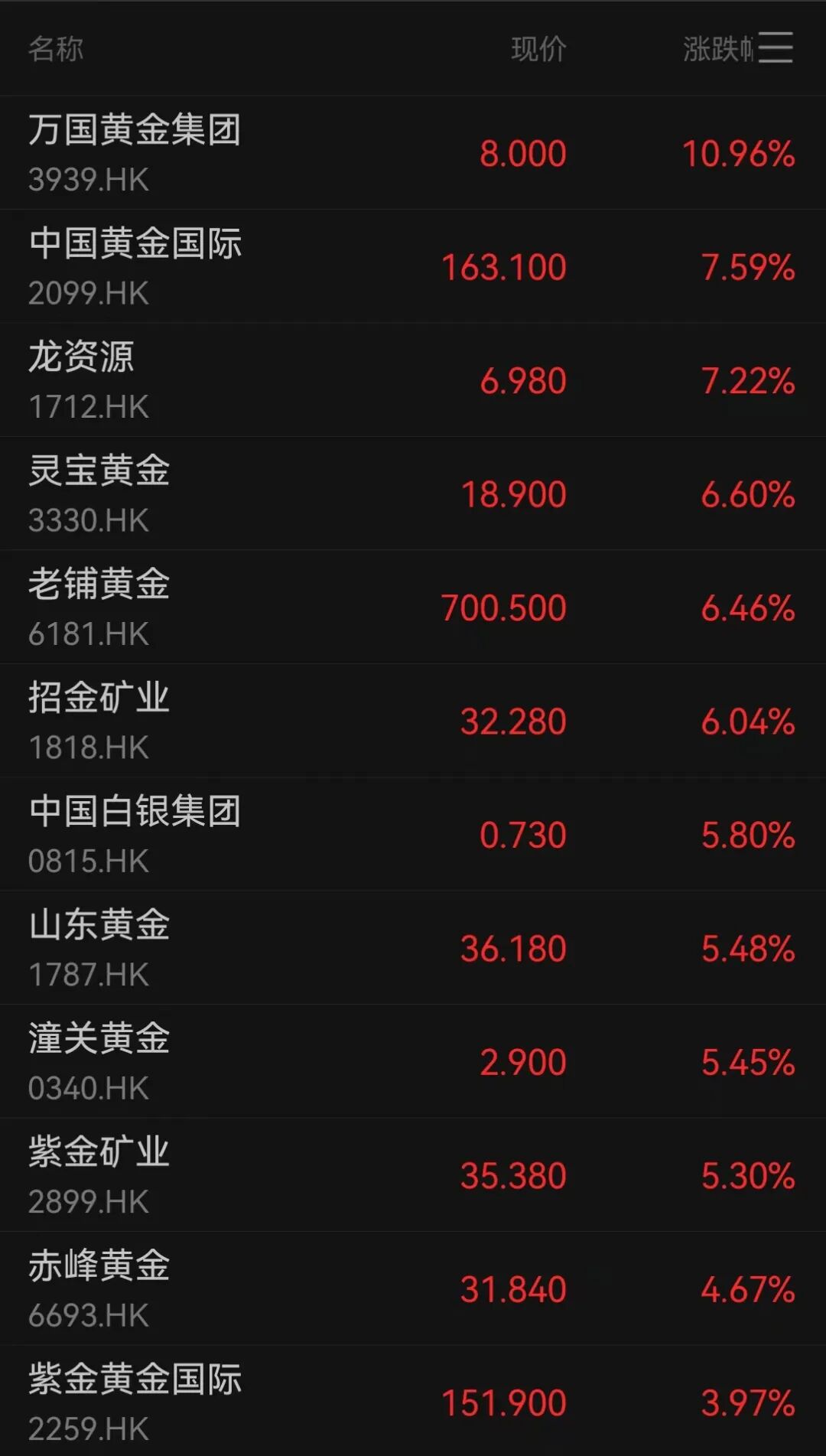 黄金股普涨,万国黄金集团涨近11%,中国黄金国际涨超7%,老铺黄金、灵宝黄金涨超6%,山东黄金等涨超5%。
