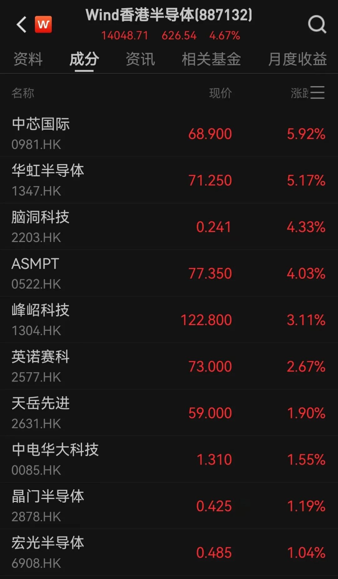 半导体大涨,中芯国际涨近6%,华虹半导体涨超5%。