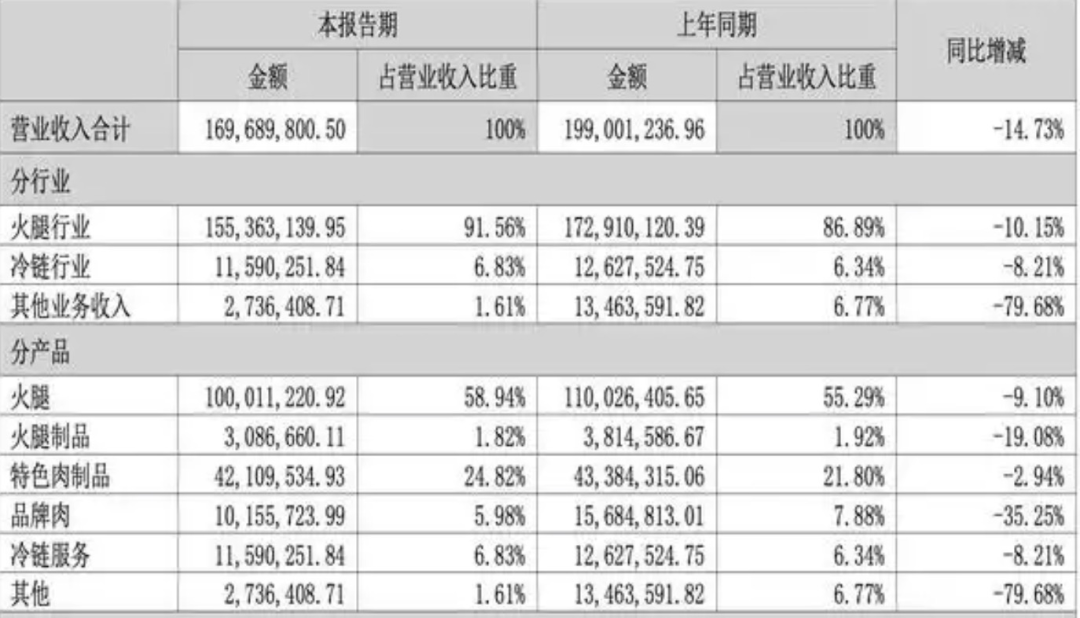 作为曾经的核心支柱火腿业务,2025年上半年营收1亿元,同比下滑9.1%。
