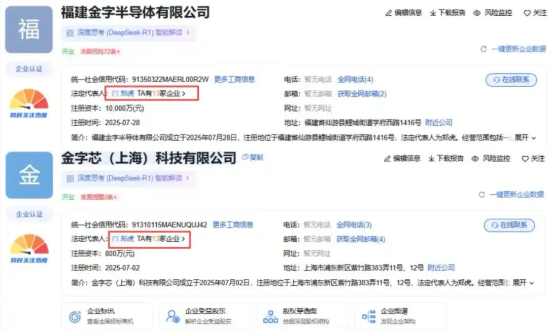 所以当她抽身后,金字火腿就在上海和福建仙游先后注册了"金字芯"和"福建金字半导体"。