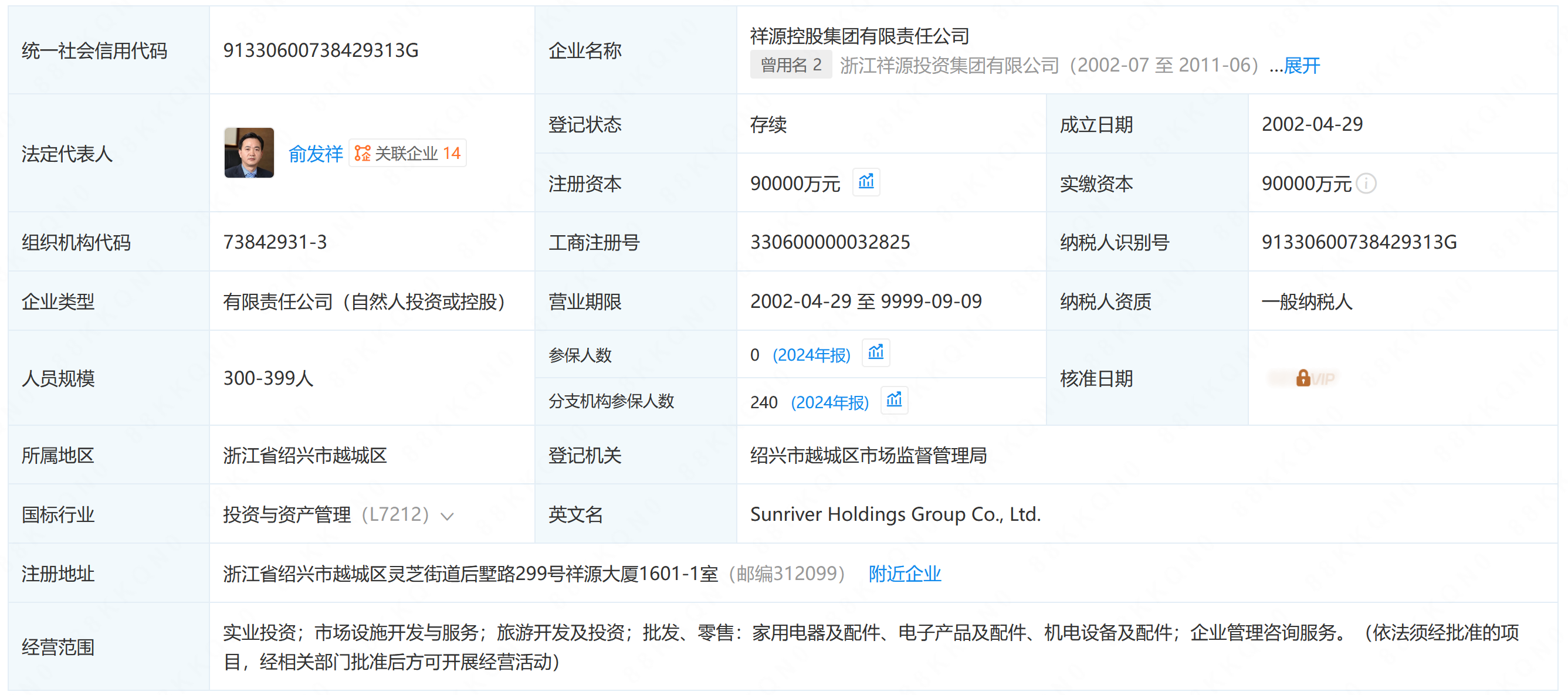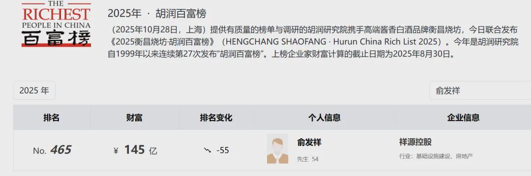 公开资料显示,俞发祥,1971年出生于浙江嵊州,现任祥源控股集团有限责任公司董事长,旗下拥有海昌海洋公园、交建股份及祥源文旅等多家上市公司。2025年10月,俞发祥以145亿元身家位列《胡润百富榜》第465位。