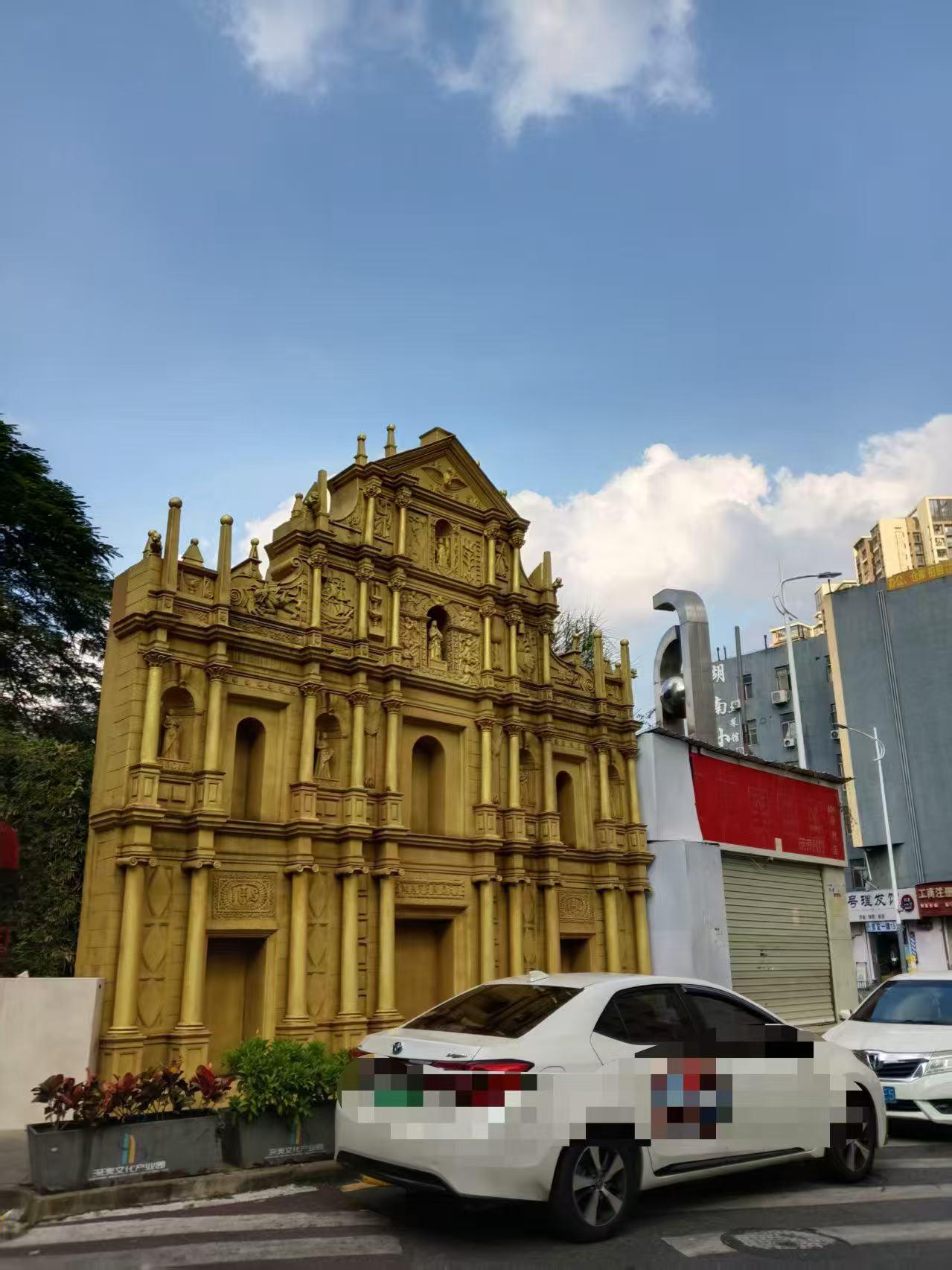 园区外,金黄色的大型牌坊仍在列 摄/何柳颖