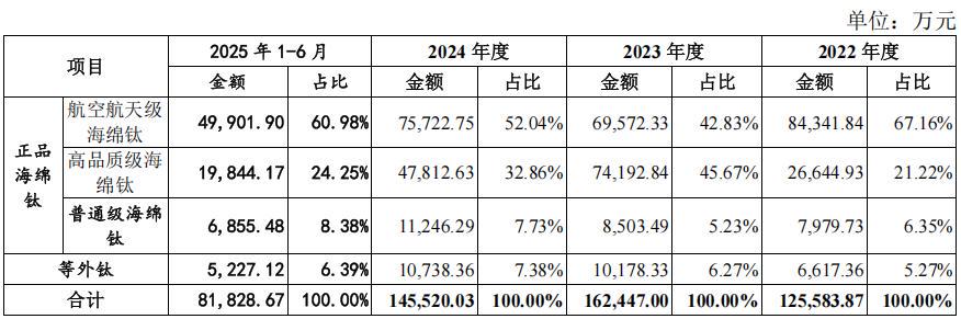 报告期内,公司正品海绵钛销售收入分别为11.897亿元、15.227亿元、13.478亿元和7.66亿元,占主营业务收入的比重分别为94.73%、93.73%、92.62%和93.61%,系公司主营业务收入的重要组成部分。
