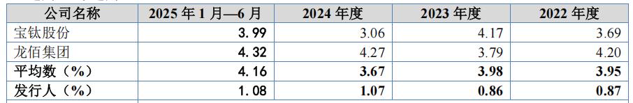 报告期内,宝钛股份研发费用率分别为3.69%、4.17%、3.06%及3.99%,龙佰集团研发费用率分别为4.20%、3.79%、4.27%及4.32%。与上述两家公司相比,公司研发费用率处于较低水平,主要系公司研发活动主要围绕主营产品高端海绵钛系列产品开展研发,因此海绵钛系列产品研发项目在研发过程中会产生对应海绵钛产品,从而公司存在对外出售研发活动所产生产品的情形。