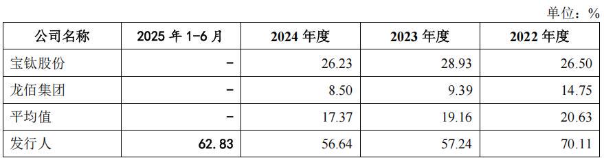 公司解释为报告期内,公司聚焦于海绵钛系列产品的研发、生产和销售;宝钛股份是我国最大的以钛及钛合金为主的专业化稀有金属生产科研基地,公司竞争对手系宝钛股份控股子公司宝钛华神,宝钛华神主要从事海绵钛、海绵锆的研发、生产、销售;龙佰集团主要从事钛白粉、海绵钛、锆制品、锂电正负极材料等产品的生产与销售,公司竞争对手系龙佰集团控股子公司云南国钛,云南国钛主要从事海绵钛的研发、生产、销售。考虑到可比公司主营业务范围差异对毛利率的影响,选取海绵钛业务毛利率进行对比。