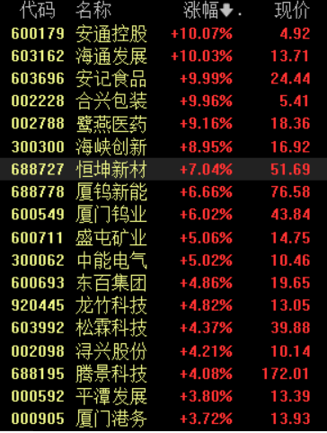 12月23日,福建板块异动拉升,截至发稿,安通控股、安记食品、合兴包装二连板,海通发展直线拉升涨停,鹭燕医药、海峡创新、厦门港务、平潭发展等个股跟涨。