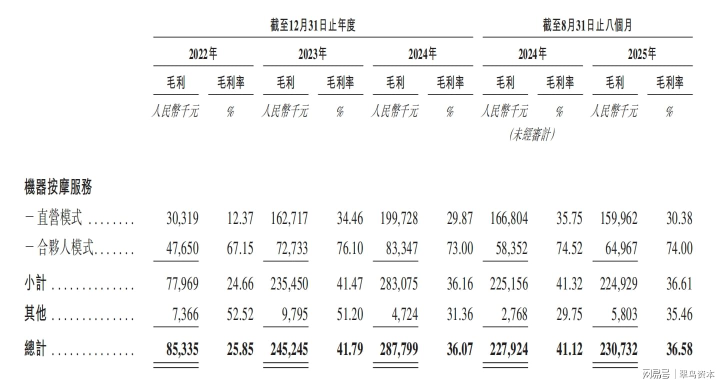 2023年消费复苏推动机器按摩服务毛利率升至41.47%的峰值,2024年回落至36.16%,2025年前8个月虽微升至36.61%,但仍低于2024年同期的41.32%。