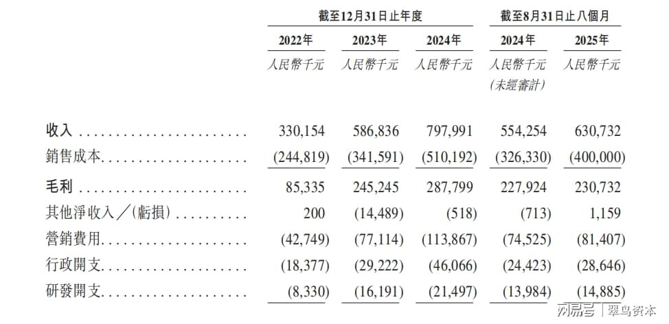 与营收减速形成鲜明反差的,是销售成本的持续高增。公司2022年销售成本为2.45亿元,2023年增至3.42亿元(同比增长39.6%);2024年直接跳涨至5.1亿元,同比增幅达49.1%,首次反超营收增速;2025年前8个月,销售成本同比增幅仍达22.6%,是同期营收增速的近1.7倍。