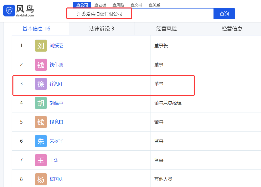 除此之外,徐湘江还在一家很重要的公司任职,也就是江苏爱涛拍卖有限公司的董事。这家公司不简单,它是爱涛文化集团旗下的公司。而爱涛文化是江苏省文物总店有限公司的唯一股东,持股100%。