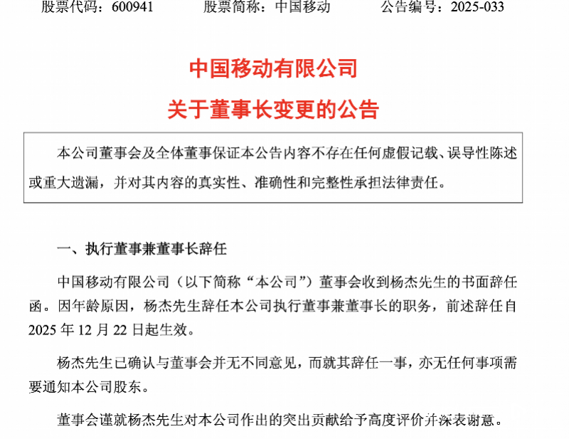 12月23日,南都湾财社记者获悉,中国移动发布公告,杨杰因年龄原因辞任公司执行董事兼董事长的职务,自2025年12月22日起生效。