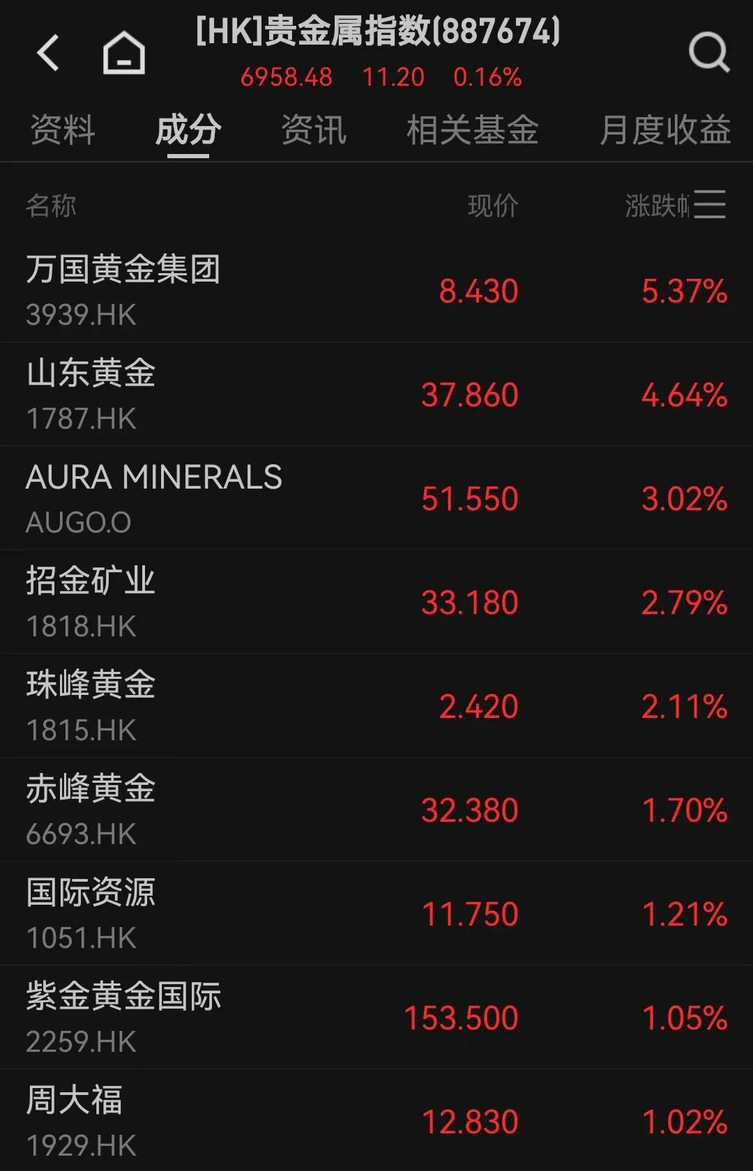 黄金股继续上涨,万国黄金集团涨超5%,山东黄金涨超4%,招金矿业、珠峰黄金涨超2%。