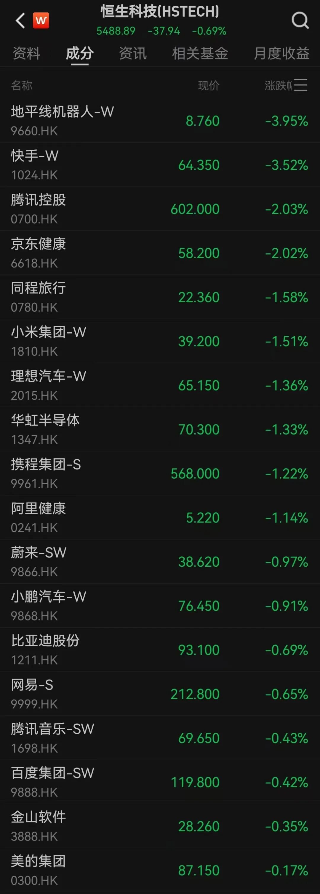 科网股多数下跌,地平线机器人跌近4%,腾讯控股跌超2%,小米集团、携程集团跌超1%。