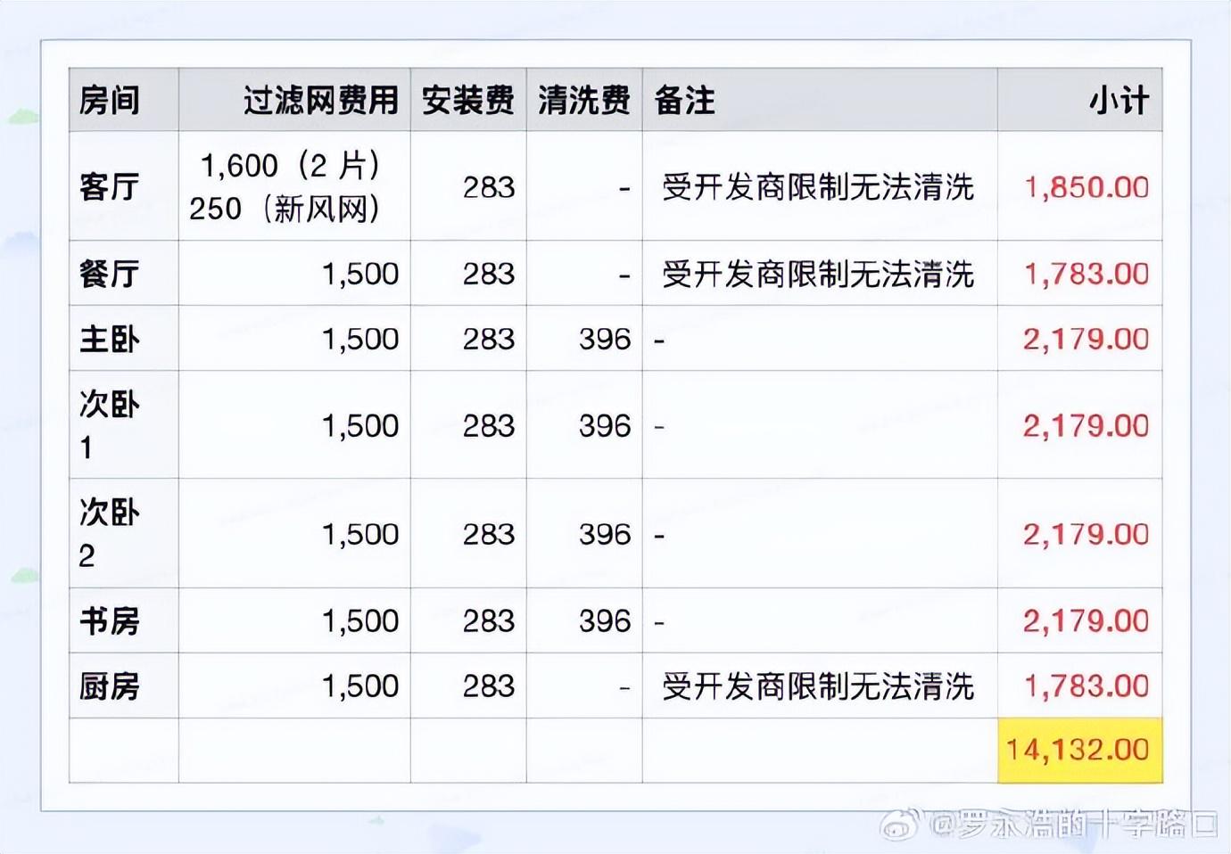在罗永浩吐槽大金空调的这条微博中,他罗列了更换滤网和清洗空调的费用明细。其中,由于大金的滤网设计使用寿命仅有一年,更换滤网是本次服务的大头,占总费用的70%。