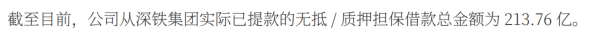 根据股东借款框架协议,深圳地铁向万科提供的借款,万科须为每笔借款提供抵质押担保。截至2025年11月13日,万科实际从深圳地铁提取的无担保借款金额为213.76亿元。