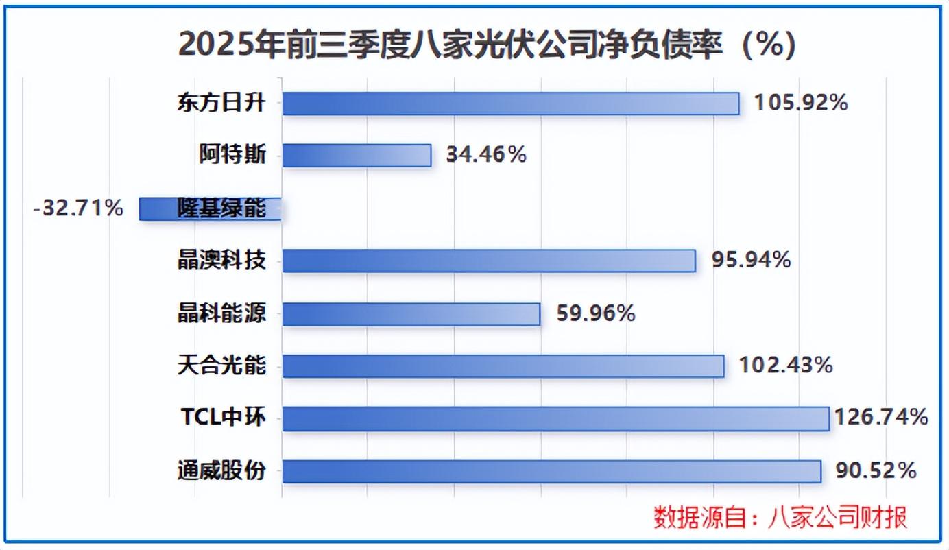 2025年前三季度,有不少企业的净负债率暂时超过100%。而隆基绿能由于货币资金高达513.66亿元,成为八家企业中唯一一家净负债率为负数的企业。