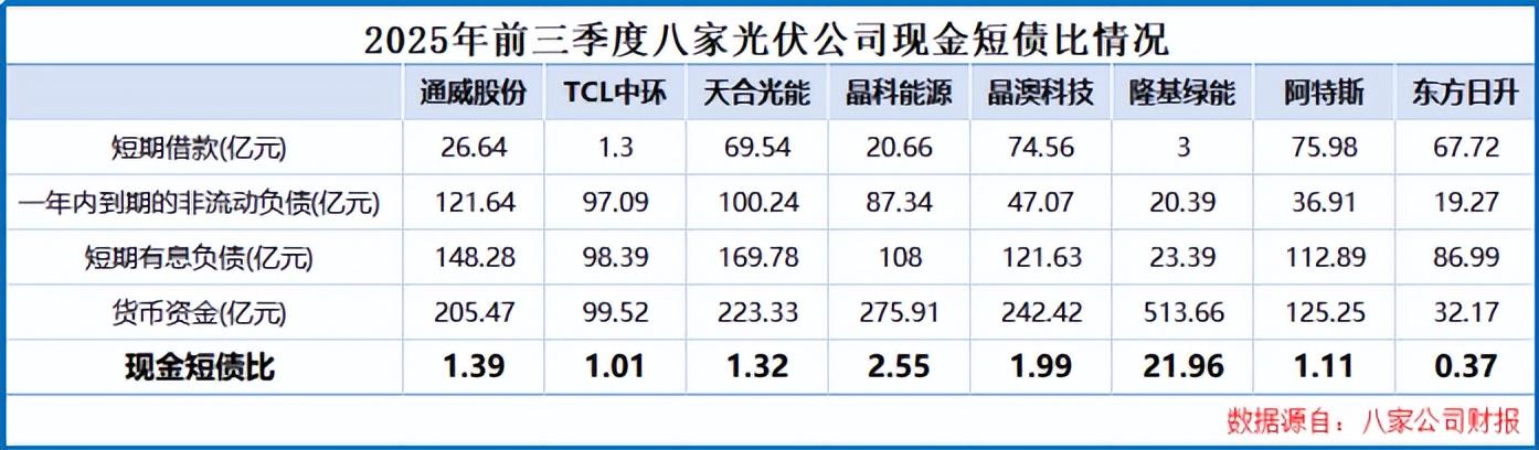 2025年前三季度,在八家光伏龙头中,除了东方日升现金短债比仅有0.37外,其他企业都在1以上,短期财务状况较为安全。