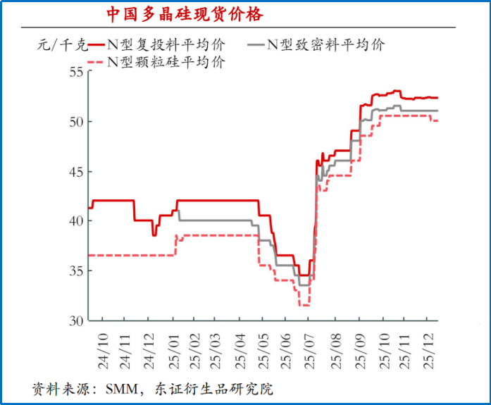 在新产能投放节奏放缓与库存加速消化的双重作用下,多晶硅价格已由2025年7月初最低的35元/kg快速回升至50元/kg以上,初步显现出产能调控的积极效果。