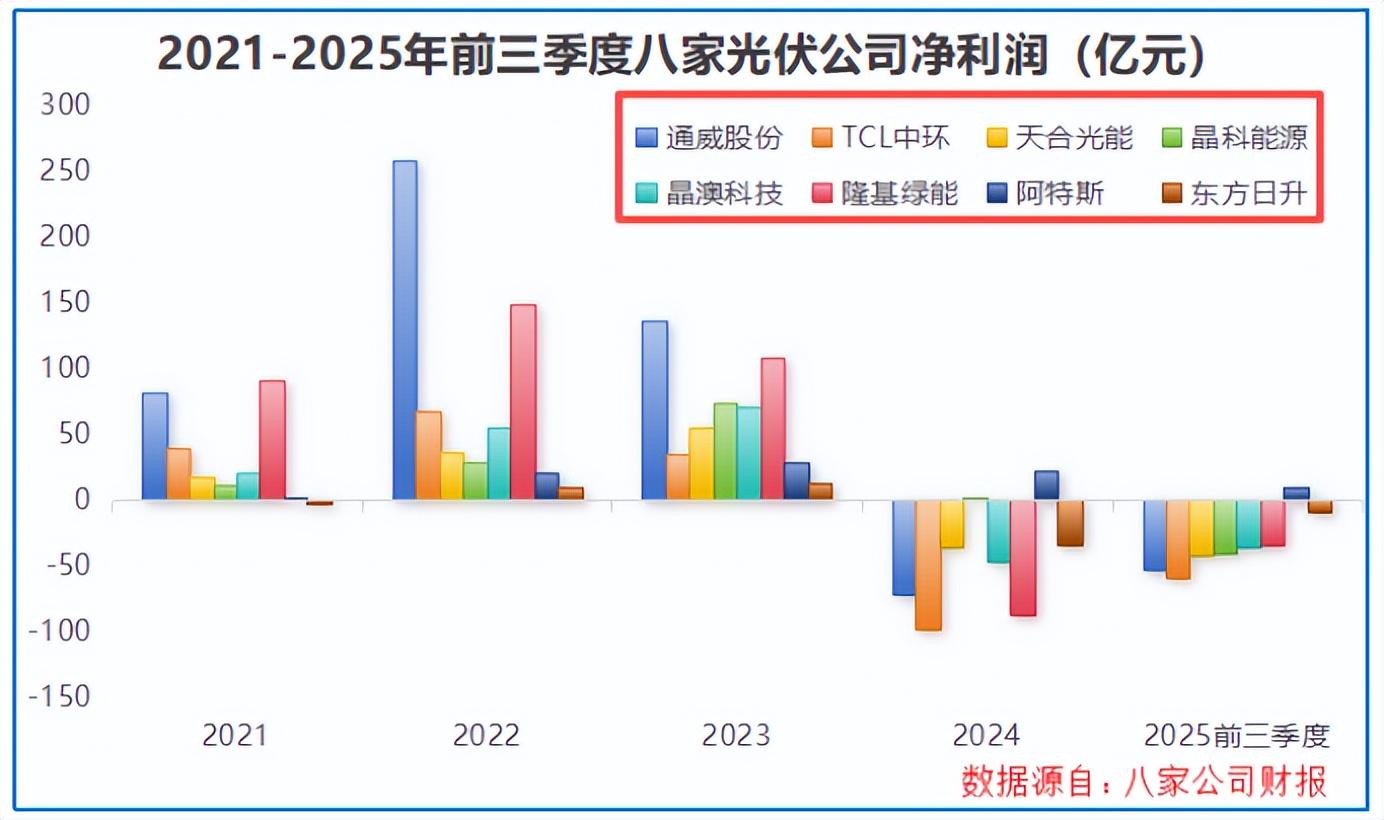 仅前三季度,通威股份、隆基绿能等如下图八家巨头就共亏损了260.68亿元。