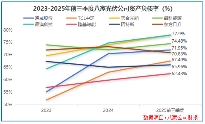从下图可见,由于前期扩产,晶澳科技、天合光能等光伏企业的资产负债率多多少少都有提升。到2025年前三季度,已有企业的资产负债率突破70%的红线。