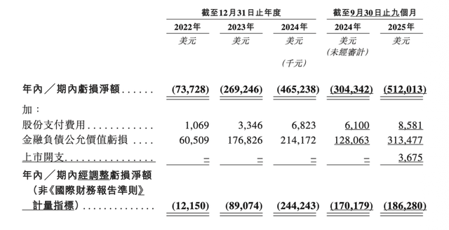 MiniMax仍在亏损,这在意料之中。根据招股书,MiniMax于2022年、2023年、2024年以及截至2024年及2025年9月30日止九个月年度,经调整亏损分别是1215万美元、8907万美元、2.44亿美元、1.7亿美元及1.86亿美元。