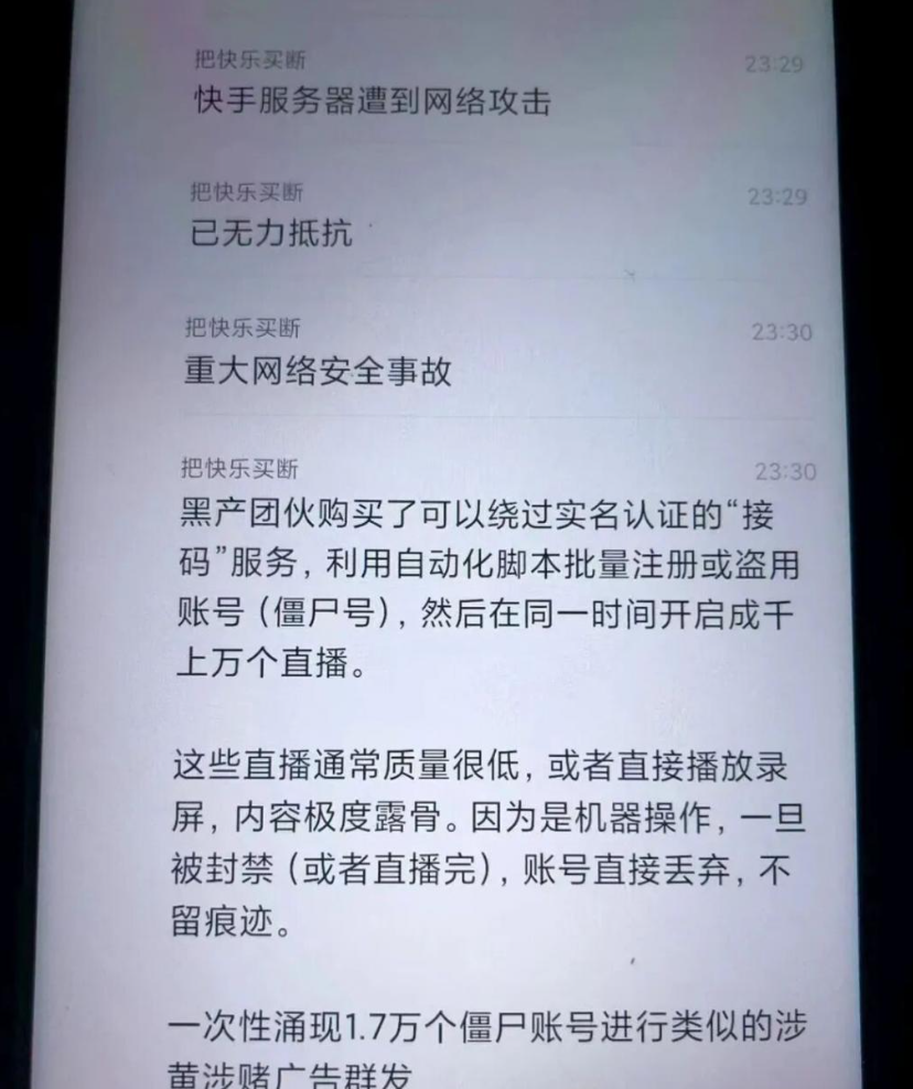 22:00后:快手官方声称在发现异常后迅速启动了应急响应机制,开始进行大规模的紧急处理,包括封禁违规直播间、切断非法直播流、追踪并封禁关联账号。