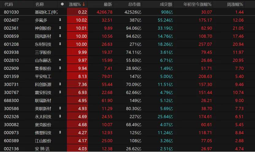 7只基础化工个股涨停,多氟多、神剑股份、国风新材、东材科技、三孚股份涨停。