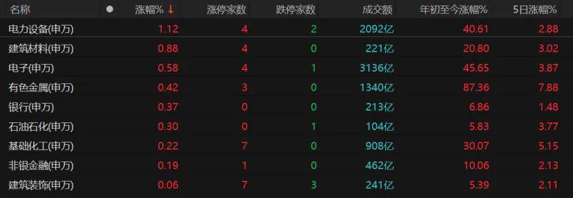 电力设备、建筑材料、电子、有色金属、银行、石油石化、基础化工、非银金融等板块微涨。个股方面,保变电气、滨海能源、天际股份、海南瑞泽、宏和科技等涨停。