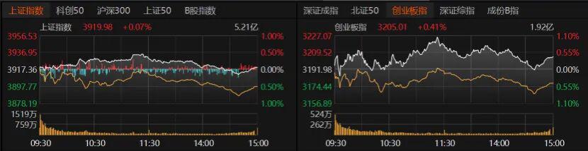 今日,沪指收涨0.07%报3919.98点,创业板指收涨0.41%报3205.01点,深证成指收涨0.27%。科创50、沪深300、上证50微涨,北证50微跌。
