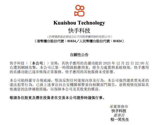 12月23日中午,快手发布公告称,快手的直播功能于2025年12月22日22:00左右遭到网络攻击,公司已第一时间启动应急预案,经全力处置与系统修复,快手应用的直播功能已逐步恢复正常服务。