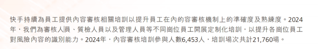日活是增长的,但是快手在内容审核方面的投入却增长缓慢。2023年,快手内容审核培训参与人数超过5600人,培训场次为26786场次。到了2024年,这一数据分别是6453人和21760场,场次同比减少5026场次。