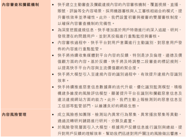 关于快手的内容审查和拦截机制,其在2024年年报中解释,快手建立了主动审查及拦截违规内容的内容审核机制,覆盖视频、直播、账号、评论等全内容场景。