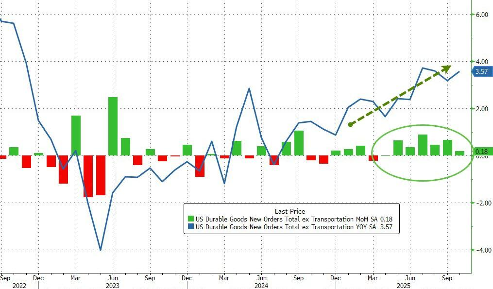 在整体数据疲软的背景下,核心资本支出领域呈现韧性。剔除飞机订单后的新订单环比增长0.5%,实现连续第四个月上涨。