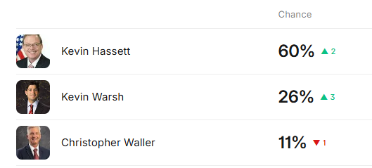 目前,哈西特已经是下任美联储主席的三位“决赛圈”选手之一。在预测市场Kalshi上,押注哈西特胜出的概率已高达60%。