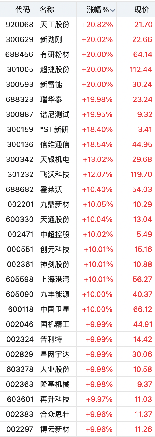 12月24日,商业航天板块低开高走,午后持续爆发。截至发稿,板块内大面积涨停,新劲刚、有研粉材、超捷股份、新雷能20%涨停;此外,瑞华泰、谱尼测试、 九鼎新材、天通股份、中超控股、创元科技、神剑股份等近20股涨停。