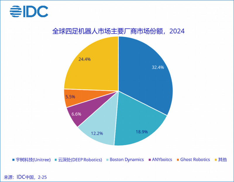 辅导备案文件显示,云深处科技的行业分类为C34通用设备制造业。国际数据公司IDC今年6月发布的《全球四足机器人市场份额》显示,2024年,全球四足机器人市场规模约1.8亿美元,产品覆盖消费级、商用级等四足机器人,销售出货量约2万台。宇树科技的消费级四足机器人以高性价比获得全球用户广泛认可,展现出强劲的国际竞争力,全球市场份额为32.4%;云深处科技的四足机器人围绕电力巡检、公共安全、应急救援等典型场景,实现规模化部署、推动技术从验证向商业化落地转变,全球市场份额为18.9%。