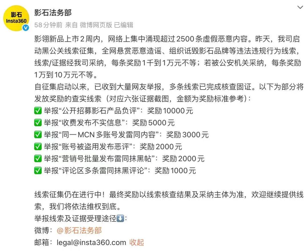 12月23日,影石法务部晒出网友举报的水军线索证据:一推广众包平台打着 “品牌种草” 的名义发布付费招募通告,明细中却明确标注 “产品负面评价内容推广”,发布一条相关内容的稿费最高达2000元,目前已有超1000人报名。针对此类恶意造谣、组织诋毁品牌的违法违规行为,影石法务部发起全网悬赏,公开征集相关线索,若线索被公安机关采纳,最高可给予10万元奖励。