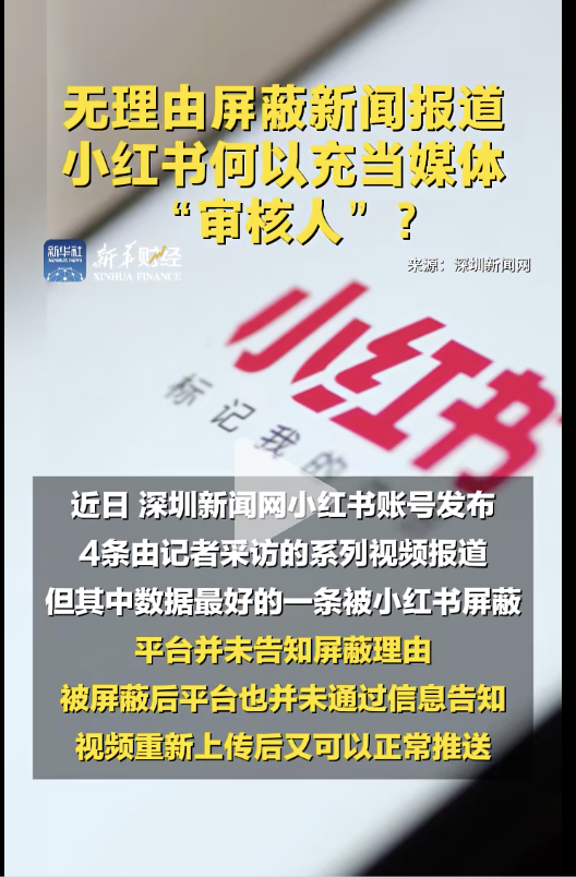 据新华财经报道,深圳新闻网小红书账号发布四条由记者采访的系列视频报道,但其中数据最好的一条被小红书屏蔽;平台并未告知屏蔽理由,被屏蔽后也并未通过信息告知,视频重新上传后又可正常推送。对此深圳新闻网质疑,小红书一来没有及时通知屏蔽行为,二来缺乏具体的违规解释,导致新闻媒体无法在第一时间进行申诉或者上传作品,更不知道修改方向。深圳新闻网称,考虑到新闻媒体本身具有的社会公共属性,小红书的无理由屏蔽行为实则是阻碍了公共信息的及时呈现,是商业平台的技术权力对公共价值的“越权审核”。