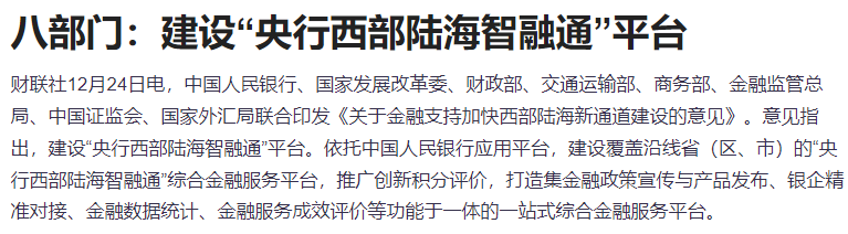 中国人民银行、国家发展改革委、财政部、交通运输部、商务部、金融监管总局、中国证监会、国家外汇局联合印发《关于金融支持加快西部陆海新通道建设的意见》。