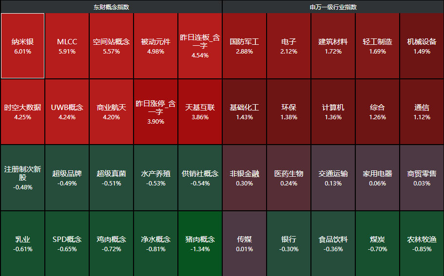 分行业来看,国防军工、电子、建筑材料、轻工制造、机械设备等行业领涨,农林牧渔、煤炭、食品饮料等行业领跌。