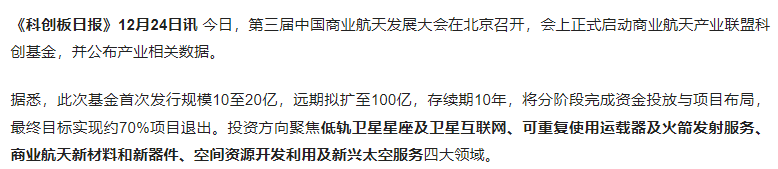 第三届中国商业航天发展大会在北京召开,会上正式启动商业航天产业联盟科创基金,并公布产业相关数据。据悉,此次基金首次发行规模10至20亿,远期拟扩至100亿,存续期10年,将分阶段完成资金投放与项目布局,最终目标实现约70%项目退出。