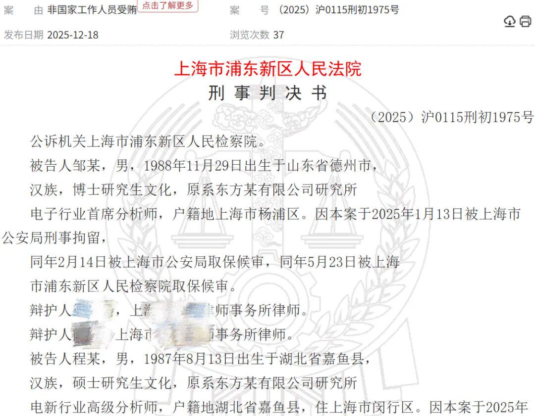 以“东方财富证券”“利通电子”为关键词检索研报可发现,2023年4月,东方财富证券曾发布题为《面板产业触底反弹,LCD精密金属结构件龙头有望充分受益》的研究报告,与判决书披露的邹某受人请托时间点不谋而合。