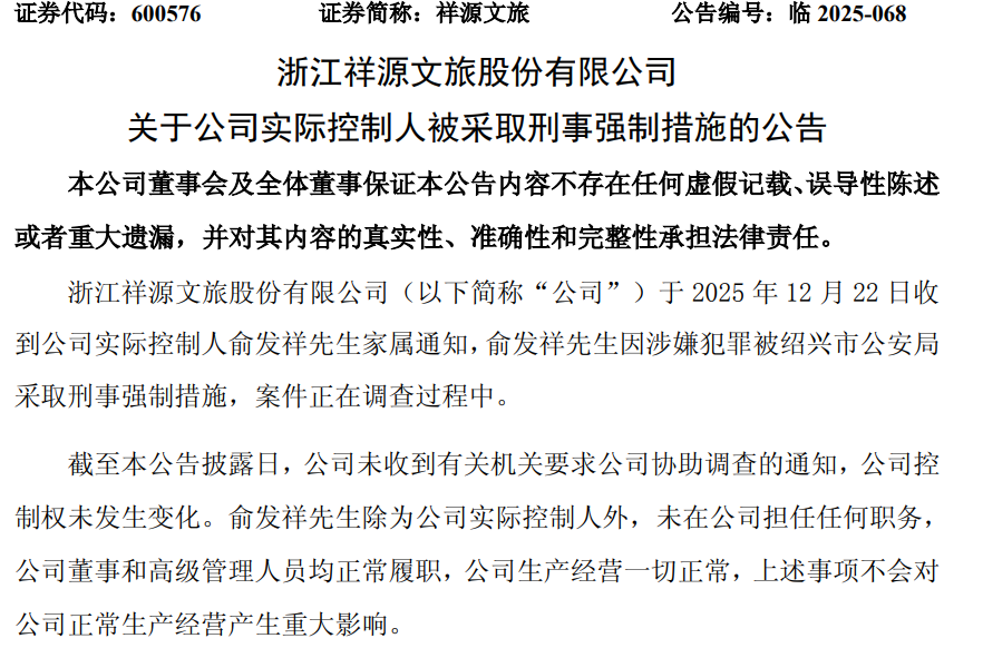 近日,上市公司祥源文旅、交建股份、海昌海洋公园接连披露公告,称收到了实际控制人俞发祥先生家属的通知,俞发祥因涉嫌犯罪,已被其家乡——浙江绍兴市的公安局采取刑事强制措施。