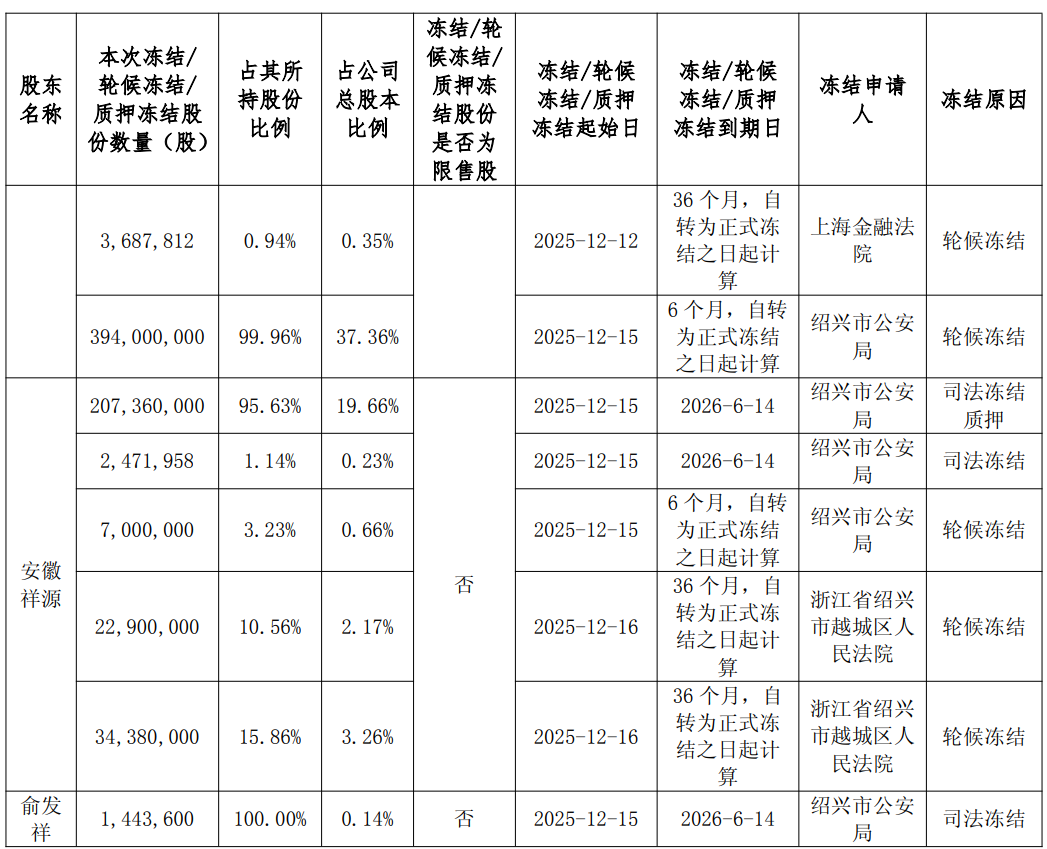 交建股份的情况同样严峻,控股股东祥源控股持有的44.32%公司股份已全部被冻结、标记及轮候冻结。实际控制人俞发祥个人持有的1572.91万股也被全额冻结。