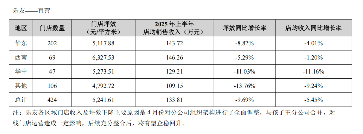 然而,从核心经营数据的下滑中可窥见,孩子王对乐友国际的并购,如今正经历阵痛。2025年上半年,乐友国际直营店坪效同比下滑9.69%至5241.61元/平方米,店均销售收入则下降5.45%至133.81万元。对此,孩子王解释称,主要原因是4月份对分公司组织架构进行了全面调整,与孩子王分公司合并,对一线门店运营造成一定影响。