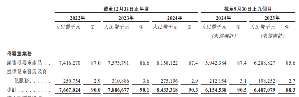 事实上,孩子王的毛利率始终受其母婴童业务牵动,其过往营收也高度依赖母婴产品。招股书显示,2022年、2023年、2024年及截至2025年9月30日,孩子王销售母婴童产品的收入约74.16亿元、75.76亿元、81.58亿元及62.89亿元,占比分别达总收入的87%、86.6%、87.4%以及85.6%。