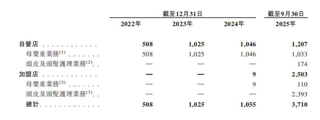 招股书数据显示,截至今年三季度末,孩子王在国内共有3710家线下店,包括母婴童业务下的1033家自营店和头皮及头发护理业务下的174家自营店,以及母婴童业务下的110家加盟店和头皮及头发护理业务下的2393家加盟店。当中,加盟店贡献收入占比已由2024年末的0.2%逐步提升至今年前三季度末的4.3%。