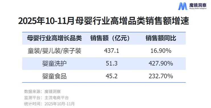 魔镜分析+ 监测数据显示,2025年10-11月,婴童洗护类目迎来爆发式增长,期间销售额达51.3亿元,同比增速高达427.9%,成为母婴行业中增长亮眼的赛道。
