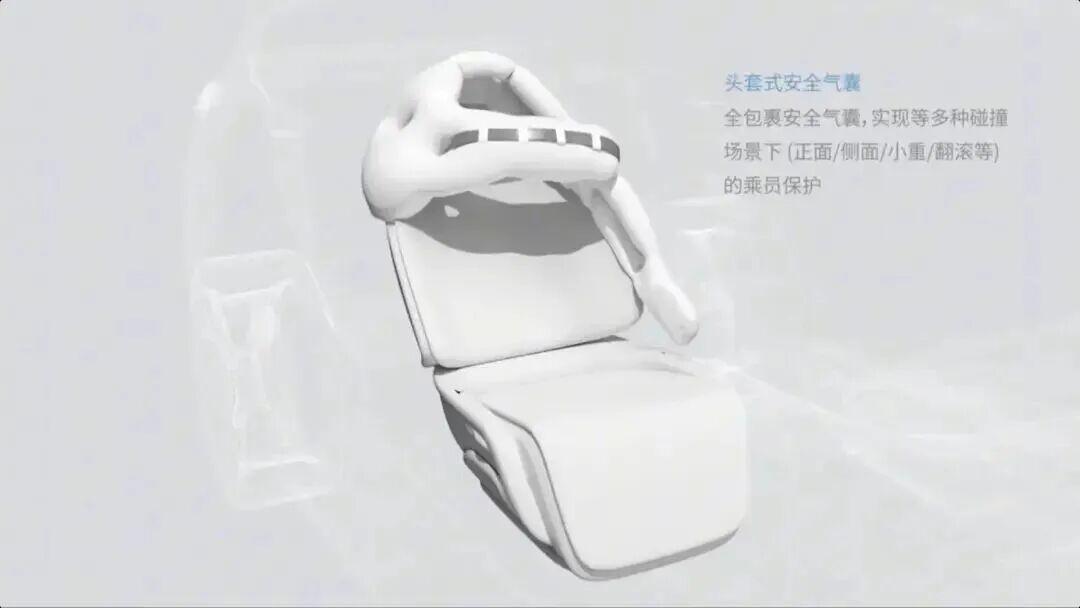 这个特殊的气囊被集成在座椅靠背顶部,触发瞬间会形成一个独特的「U 型」环绕结构,像一顶巨大的兜帽,从上方和两侧迅速包裹住乘客的头、颈和胸部。它不仅能应对正面碰撞,在MPV比较担心的翻滚事故中,这个环抱结构都能死死锁住乘客的躯干,防止头部撞向B柱。而且,这个「兜帽」只是最后一道防线。在它启动之前,智界V9还有一连串联动动作来对抗物理惯性。