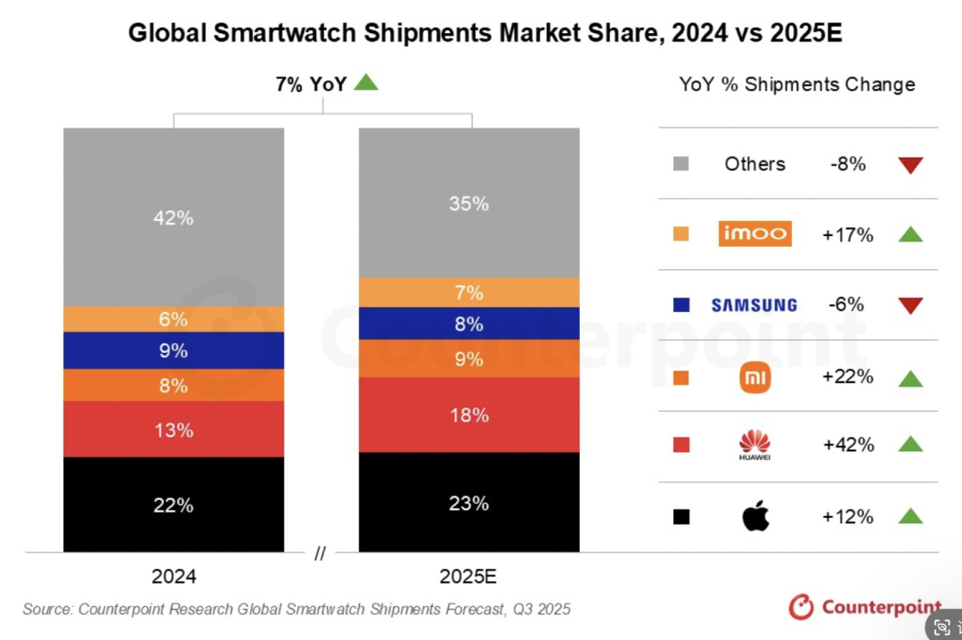 12月24日,数据咨询机构Counterpoint Research发布的最新报告显示,在经历2024年的大幅下滑后,全球智能手表出货量预计将在华为和苹果的带动下于2025年同比增长7%。同时,品牌竞争格局出现显著重构——小米成功反超三星跻身第三位,苹果也结束了连续七个季度下滑的局面。